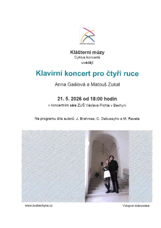 Zveme vás na Klavírní koncert pro čtyři ruce v rámci cyklu Klášterní múzy III. ročník, kde díla autorů J. Brahmse, C. Debussyho a M. Ravela zahrají Anna Gálová a Matouš Zukal. Přijďte 21. 5. od 18 hodin do Koncertního sálu.